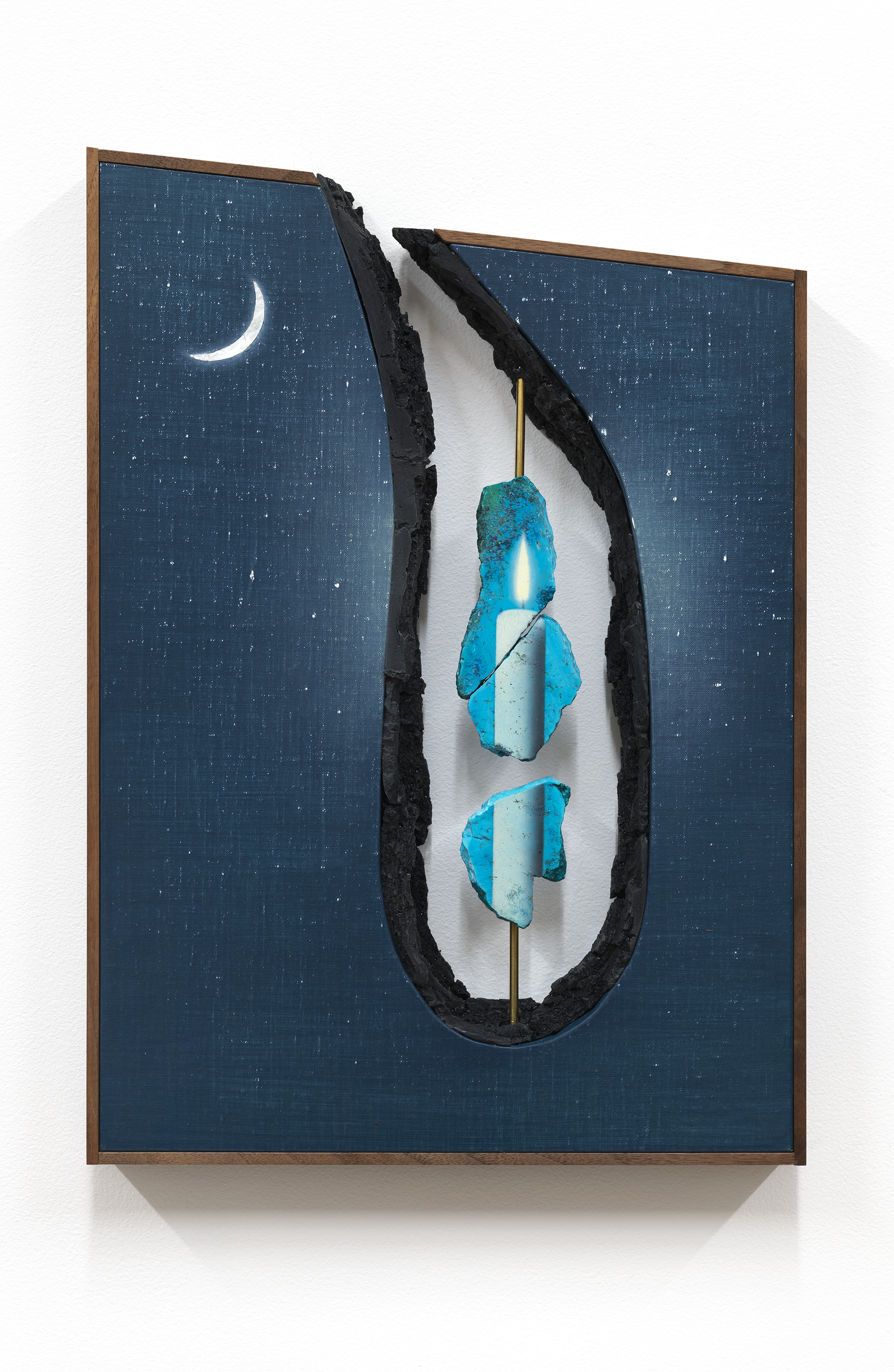 Oil on linen over panel, mother of pearl inlay, turquoise, brass, cast resin, in artist’s frame