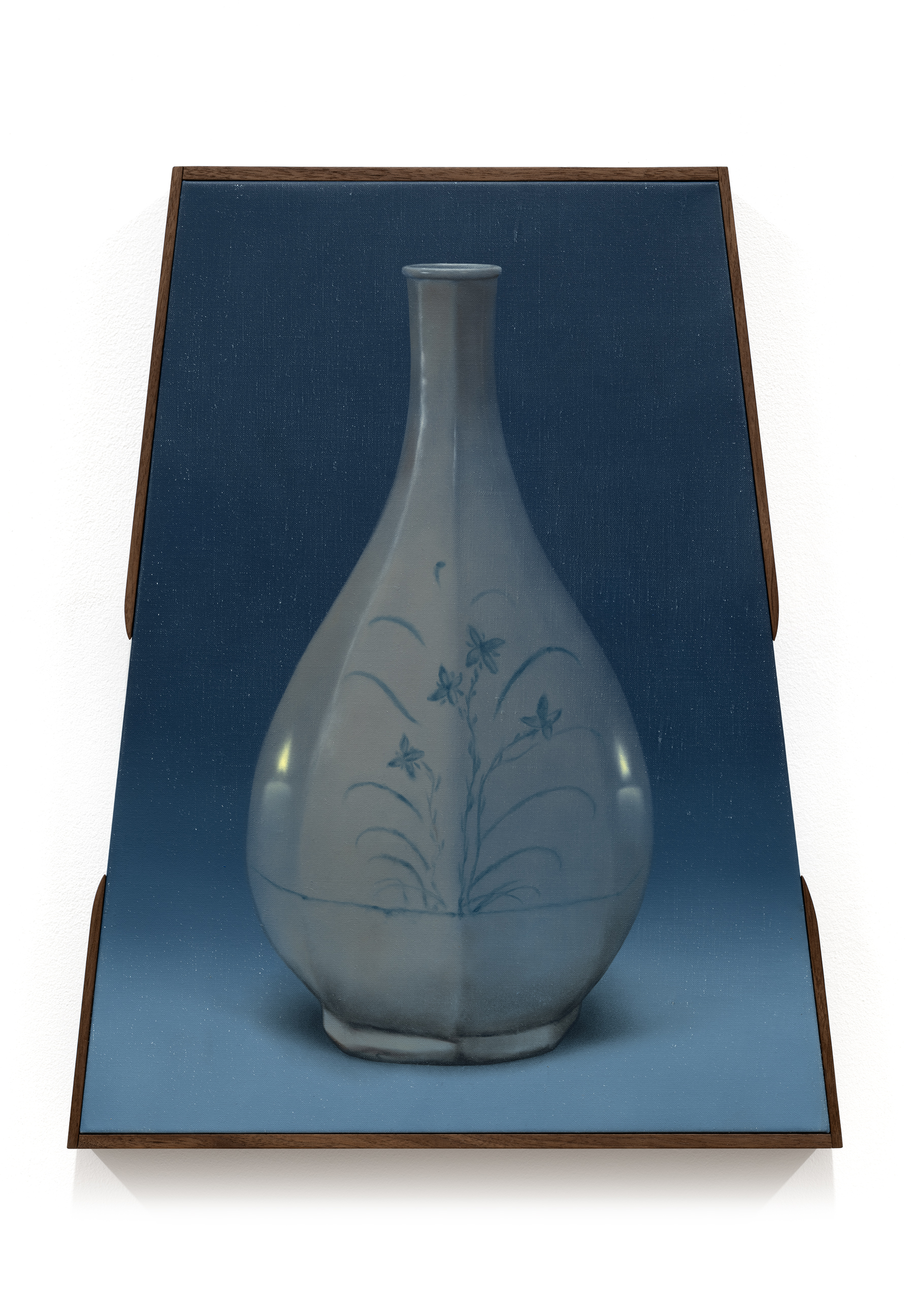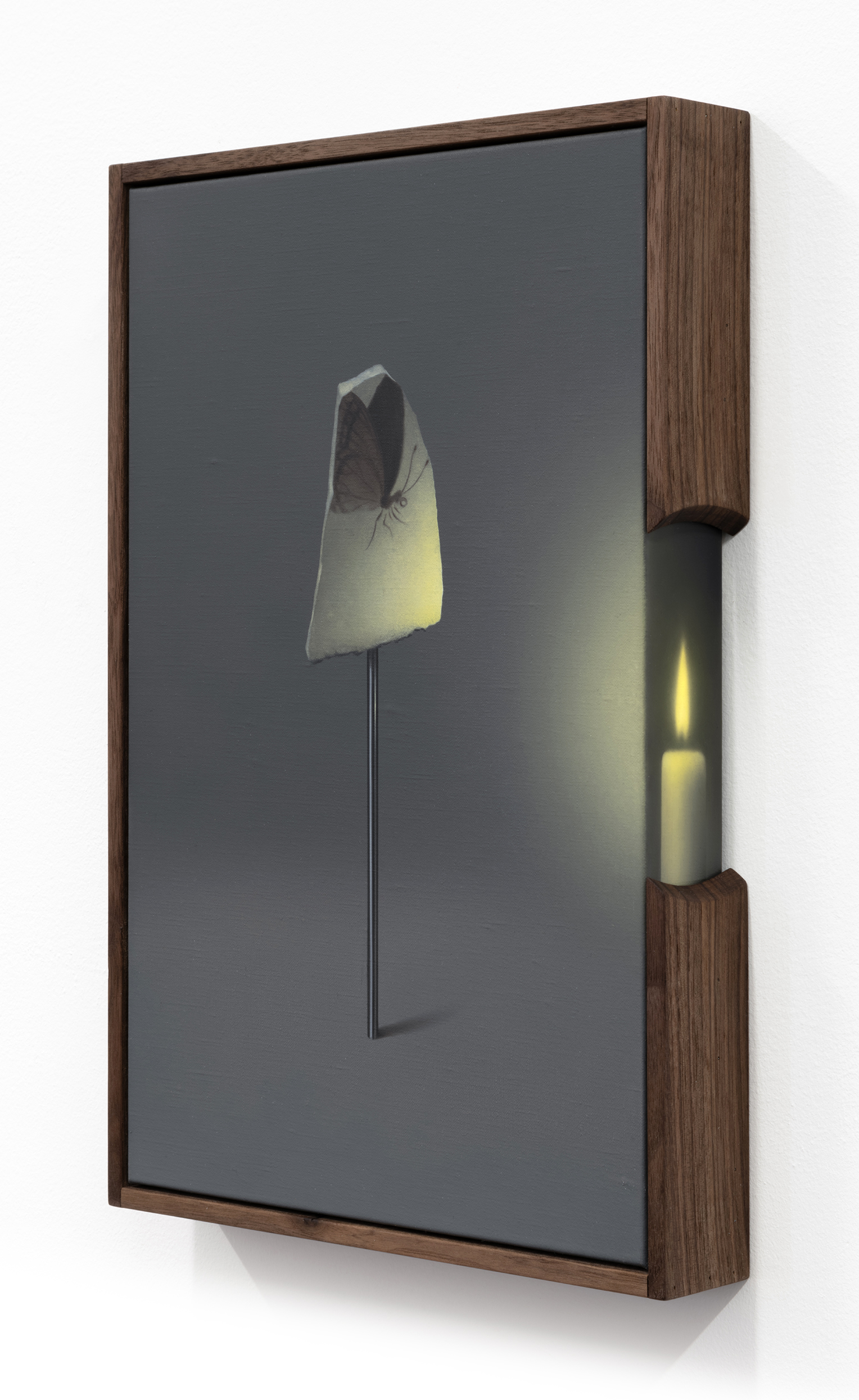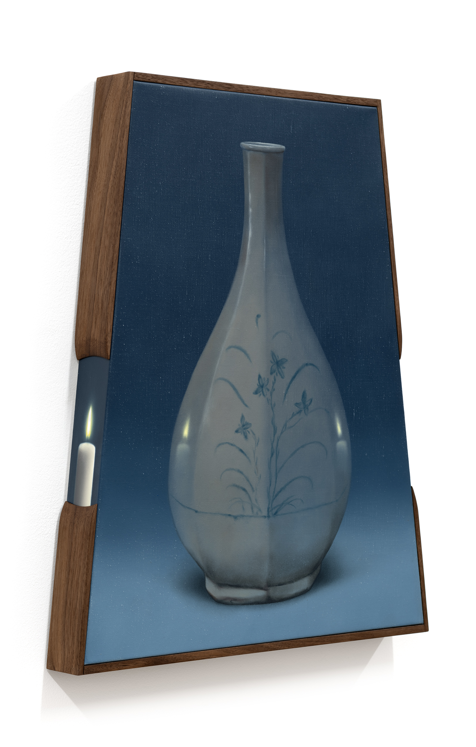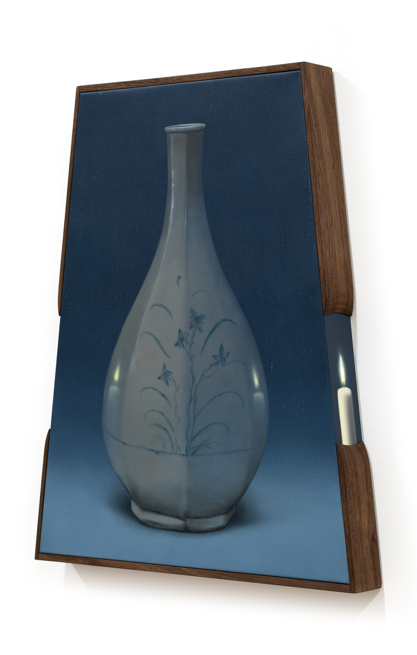 Oil on linen over panel, mother of pearl inlay, cast resin, 31.5 x 16 inches